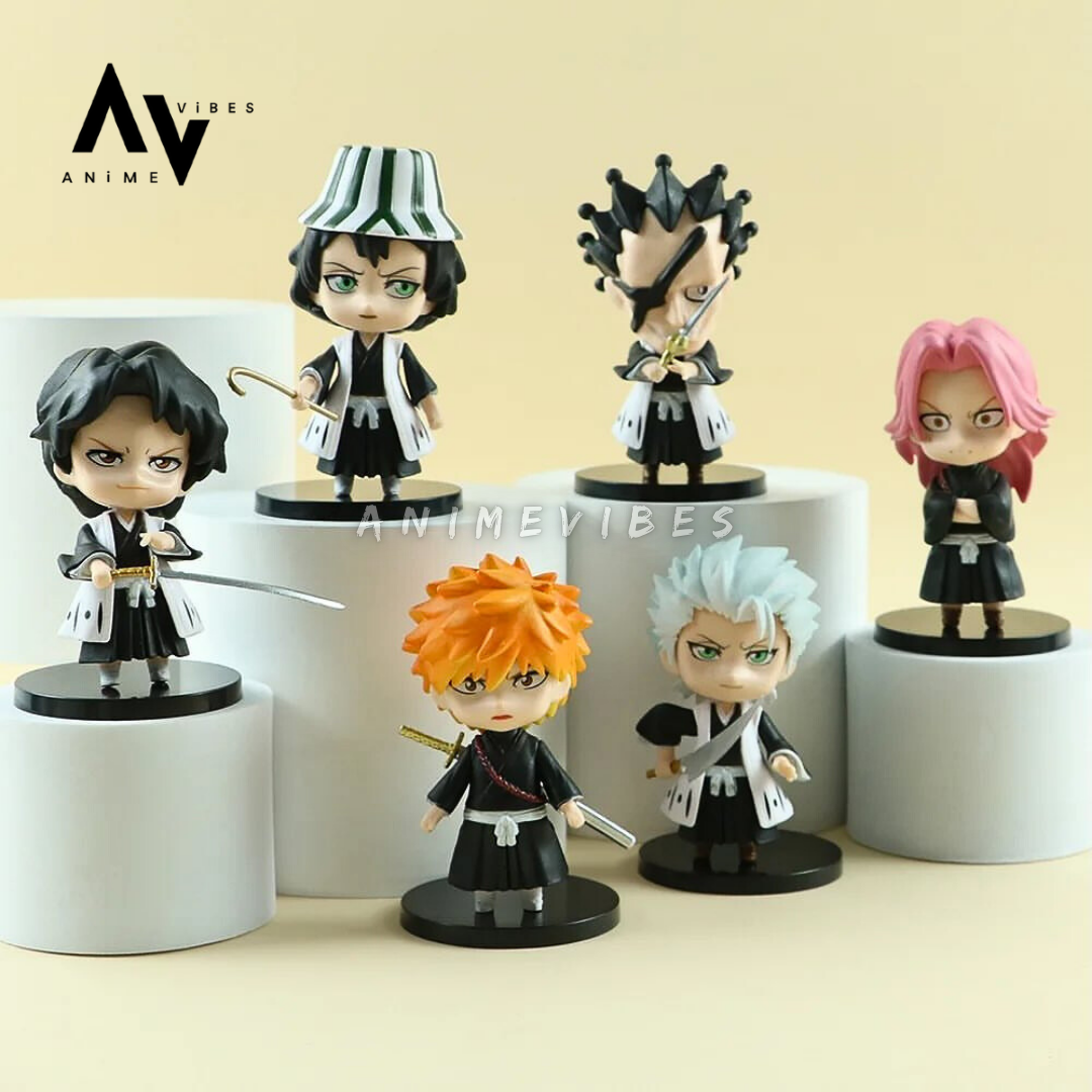 Step into the world of Soul Society with this exclusive AnimeVibes set of 6 iconic Bleach action figures, featuring legends like Ichigo Kurosaki, Kisuke Urahara, Kenpachi Zaraki, and more—all captured in chibi-style with incredible detail.