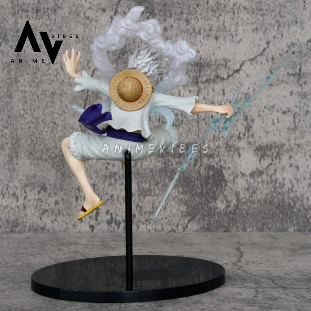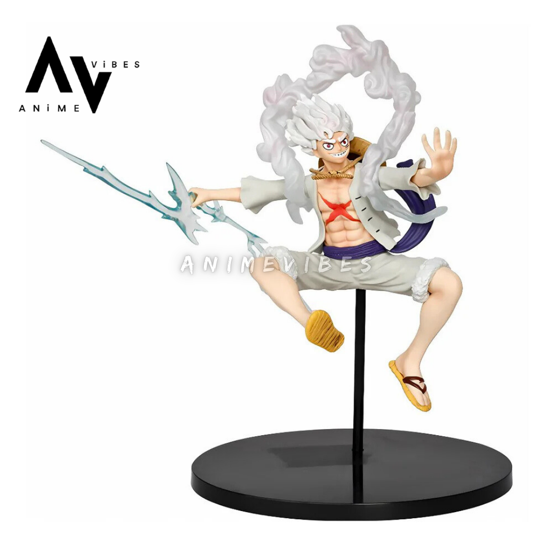 Witness Luffy in his peak form, mid-air, radiating unstoppable power and boundless joy! This 21 CM PVC action figure captures Gear 5 Luffy in motion, bringing his legendary leap to life with incredible detail.