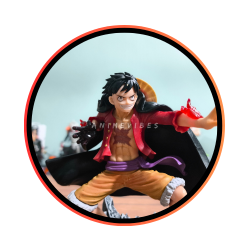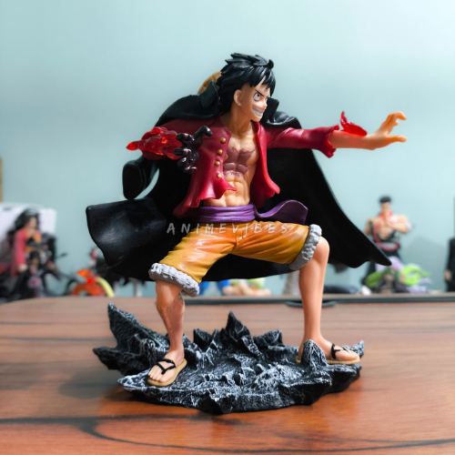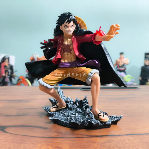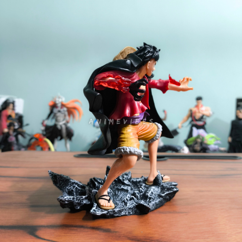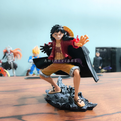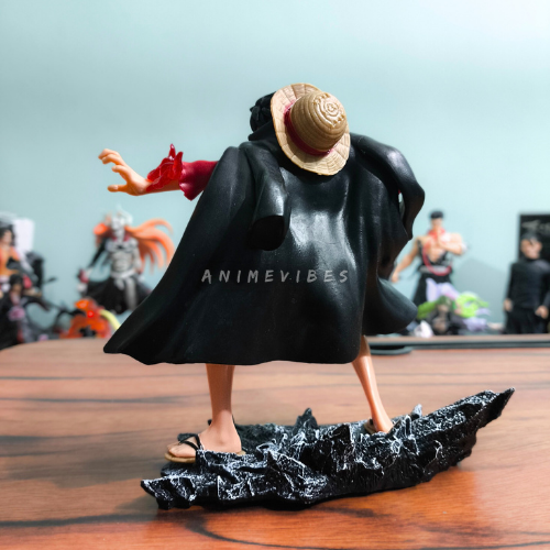 This 15cm Luffy figure captures him mid‑battle, crouched on a jagged grey rock base with his black coat flaring out behind him and red Haki flames bursting from his arm. Compact but full of motion, it shows the future King of the Pirates ready to launch his next attack, Straw Hat on his back and post‑timeskip scar across his chest on display.