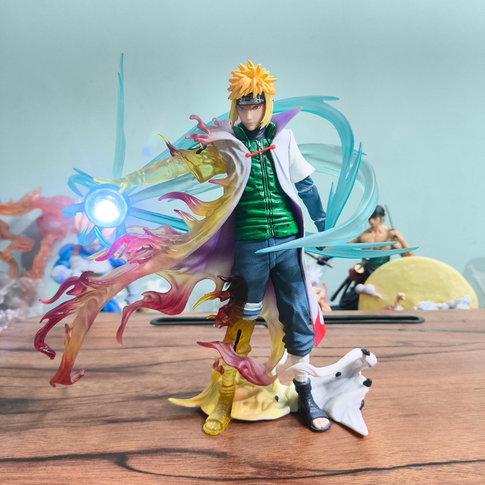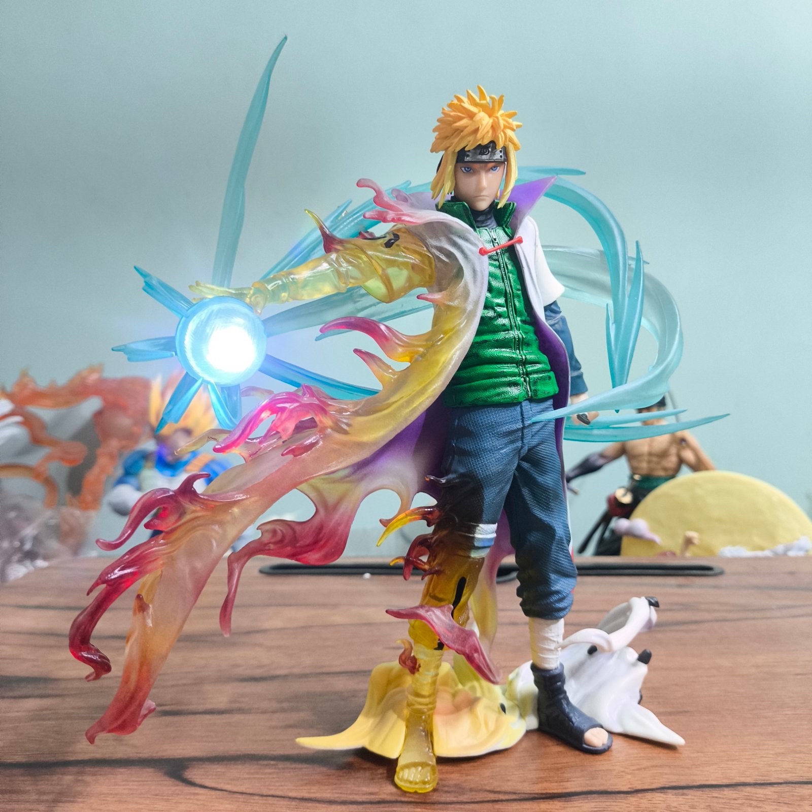 Bring home the power of Minato with this premium action figure featuring two interchangeable heads, Rasengan, and LED effects for a striking display. The figure showcases a dramatic battle pose, flowing chakra effects, and a highly detailed outfit that makes it stand out in any collection.