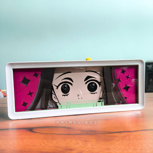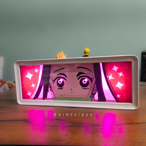 Brighten your desk with this eye-catching Nezuko LED light box, showcasing her signature wide-eyed bamboo-muzzled face peeking through pink starry patterns and flowing hair in a clean white frame. Single light mode creates a captivating pink glow ideal for shelves or workspaces.
