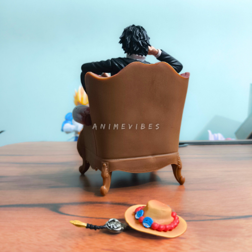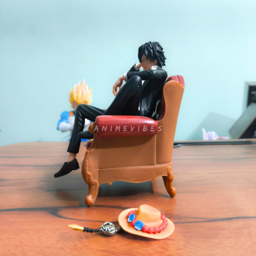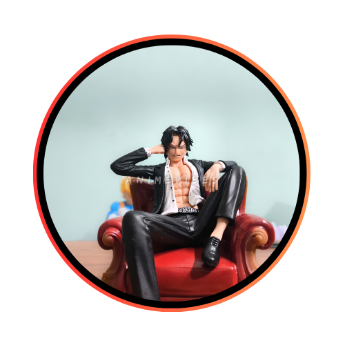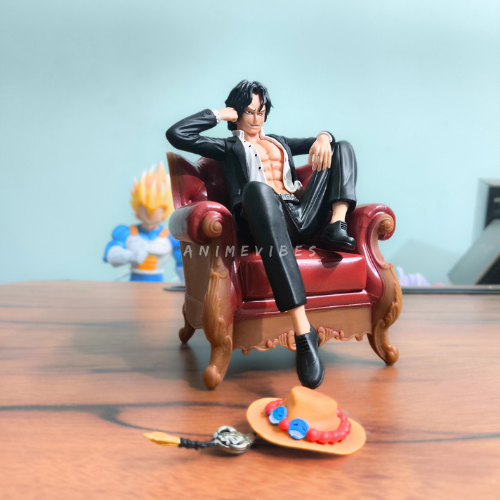 Exude effortless swagger with this 17cm Portgas D. Ace figure, lounging confidently on a luxurious red velvet armchair in his signature open black suit revealing chiseled abs. Crafted from high-grade PVC, it includes his signature orange hat with blue beads and dagger accessory placed nearby for that pirate commander vibe.