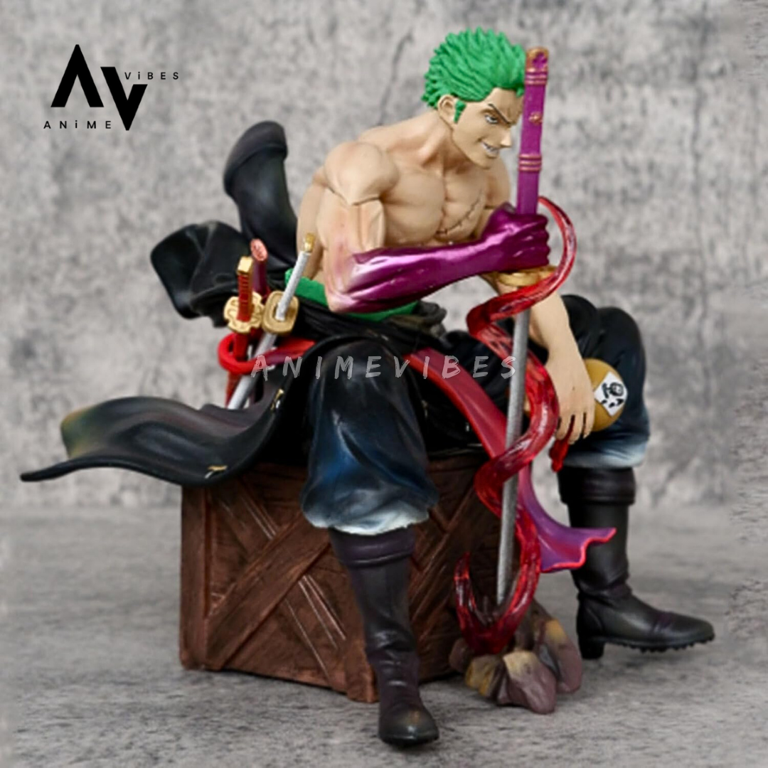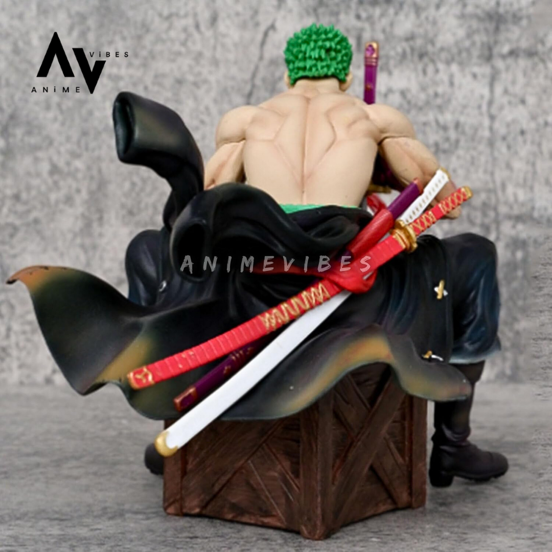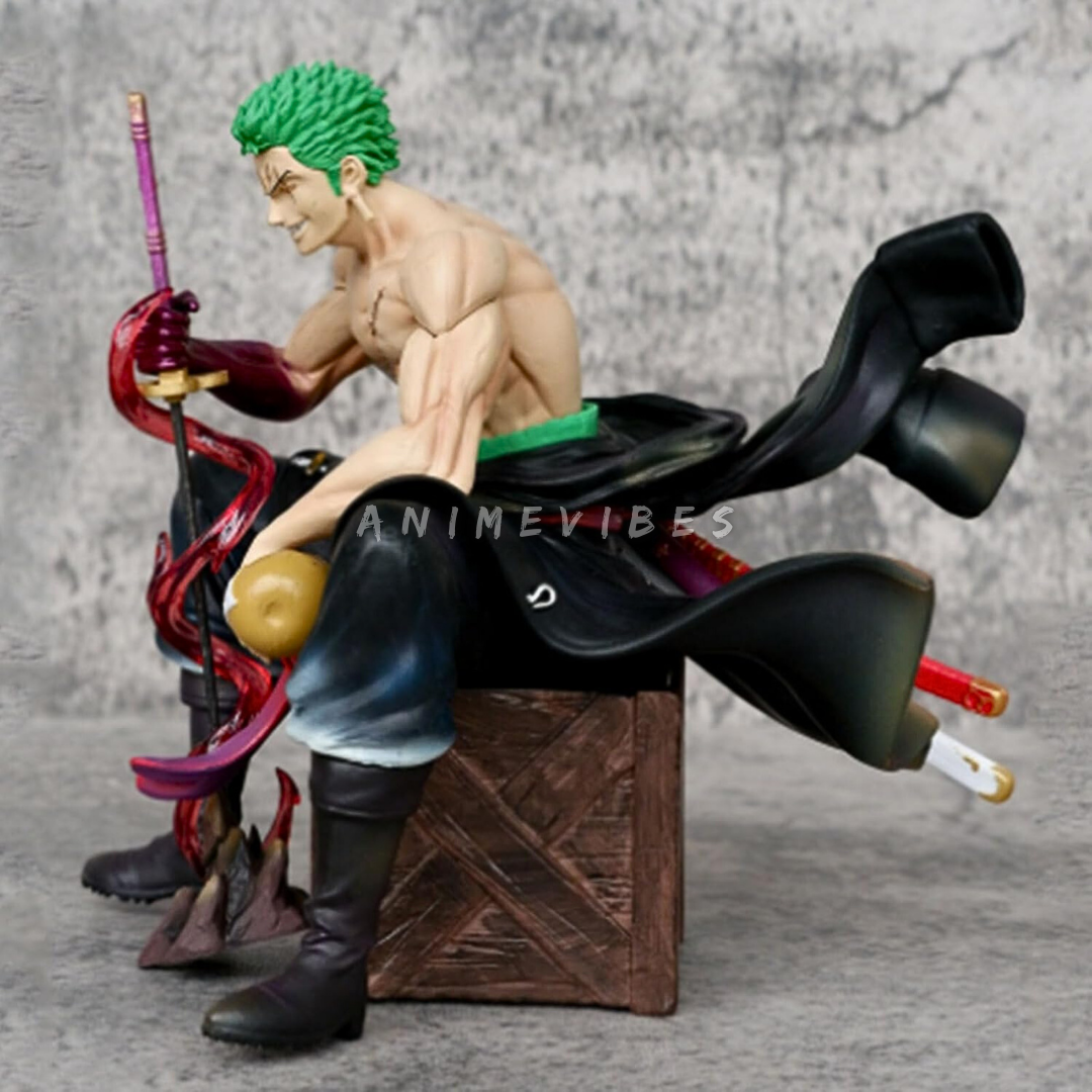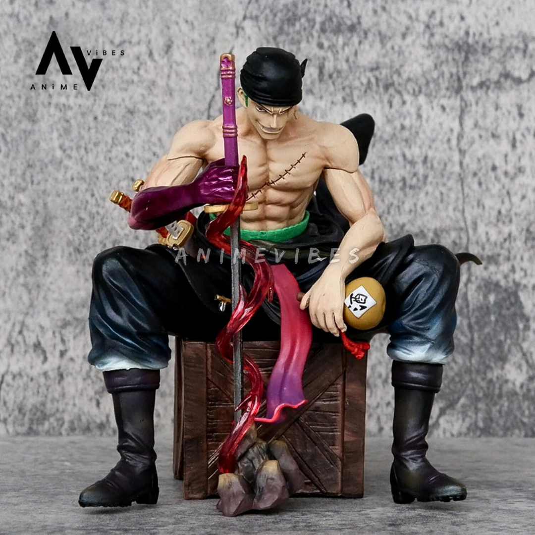 A warrior of two faces—calm in thought, fierce in battle. This 15 CM PVC action figure presents Zoro in a seated pose, with a dual-faced design capturing both his composed and battle-hardened expressions. A tribute to the unbreakable will of the OP swordsman.