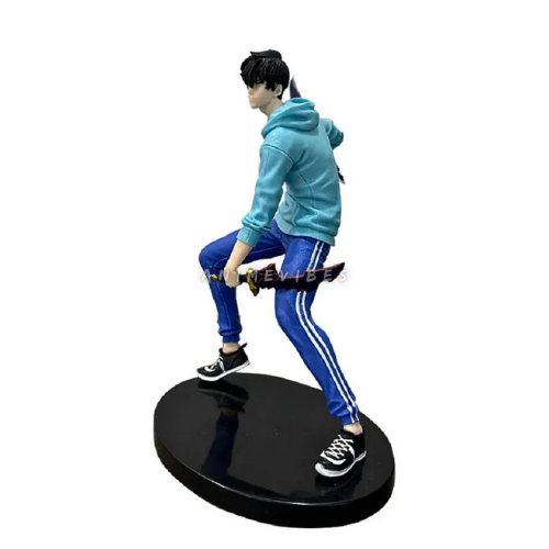 Dominate the battlefield with this sleek 18cm Sung Jin-Woo action figure, striking a fierce dual blade battle pose in his signature blue tracksuit with athletic fabric folds, intense focused expression, and shadow energy crackling around drawn daggers.