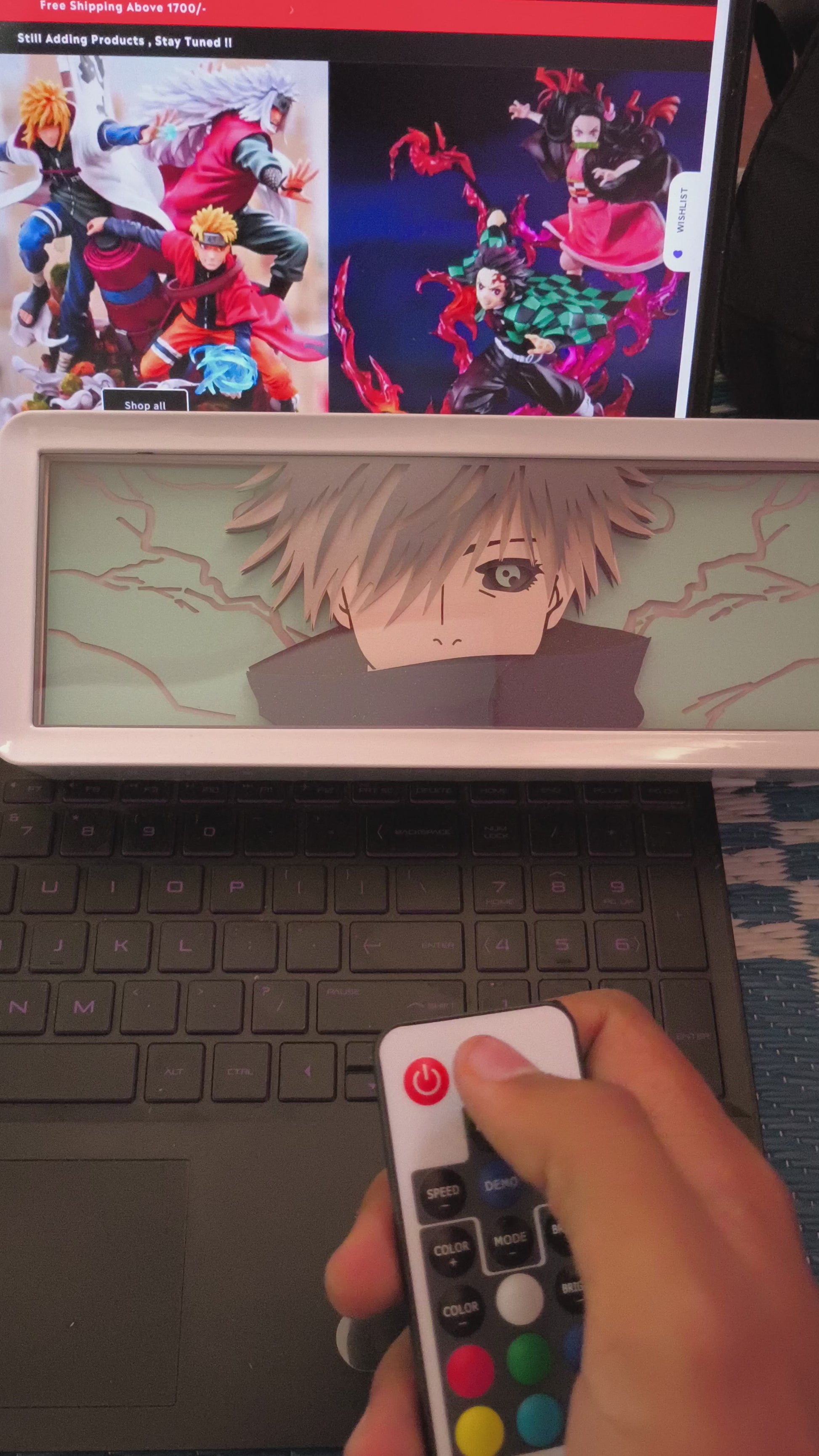 Crafted for true fans, this LED box offers USB & battery-powered options 🔋⚡, giving you the freedom to place it anywhere. With the included remote 🎮, switch between multiple colors and dynamic lighting modes to match your vibe. From an intense battle aura to a calming nightlight, Gojo’s presence never fades.